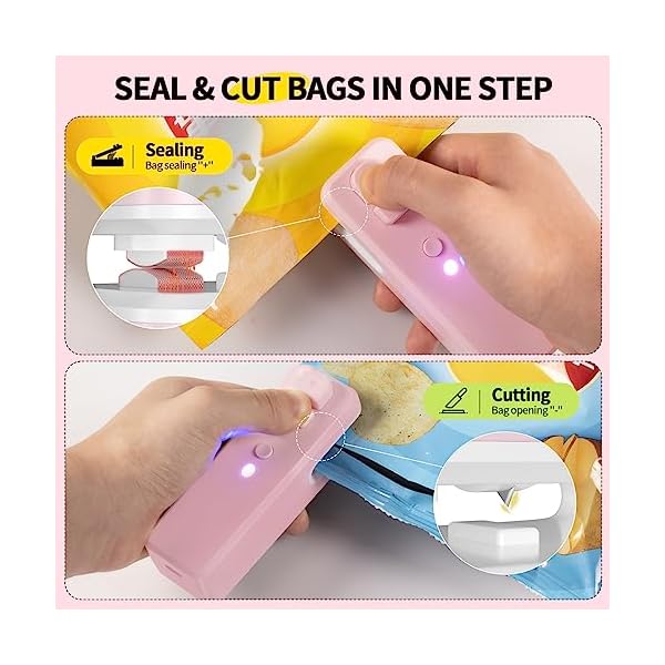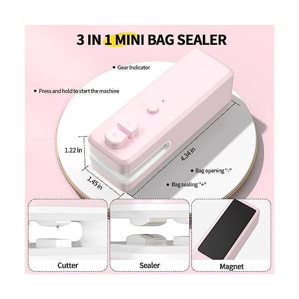 - Bag Sealer Mini, 3 in 1 Mini Bag Sealer Heat Seal with Cutter & Magnet, Rechargeable Mini Chip Bag Vacuum Sealer Machine for Reseal Plastic Bags & Keep Snacks Fresh, Portable Kitchen Gadget (PINK)