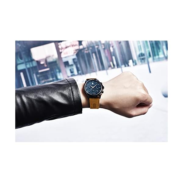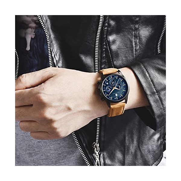 ⌚ STAINLESS STEEL CASE AND GENUINE LEATHER STRAP: Our watches are made entirely of steel. The case, crown, clasp, and back cover are all made of 304 stainless steel. It is more structured and durable. The genuine leather strap not only makes a comfortable sense for your wrist but also easy to match your clothes. It is easy to put on or take off, bringing you comfort and a gentleman-wearing experience. The fully flexible strap keeps your wrist ventilated.