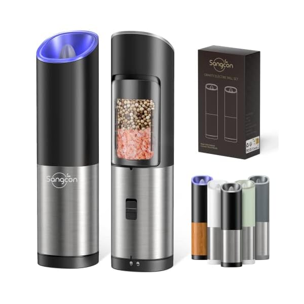 - Sangcon Electric Salt and Pepper Grinder Mill Set, Safety & Gravity Switch, Battery Powered with LED Light, Adjustable Coarseness, One Hand Automatic Operated Kitchen Gadgets, Stainless Steel, 2 Pack