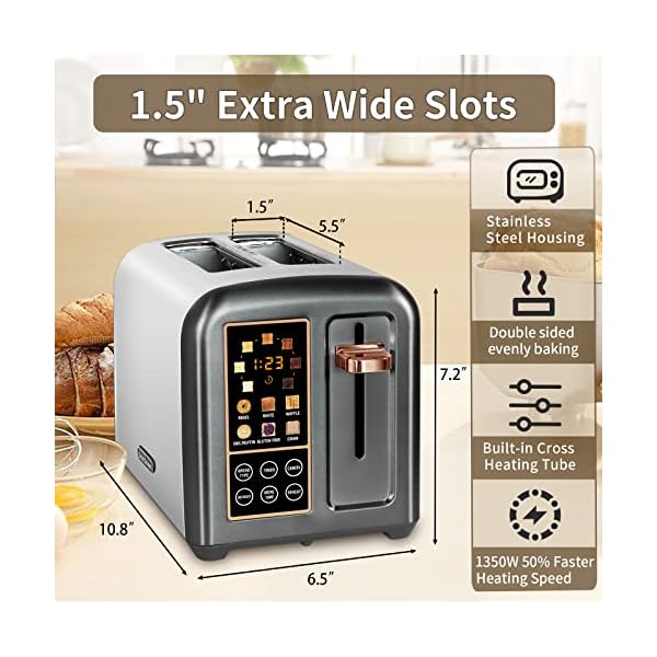 - SEEDEEM Toaster 2 Slice, Stainless Steel Bread Toaster with LCD Display and Touch Buttons, 50% Faster Heating Speed, 6 Bread Selection, 7 Shade Settings, 1.5”Wide Slots Toaster with Cancel/Defrost/Reheat Functions, Removable Crumb Tray, 1350W, Dark Metallic