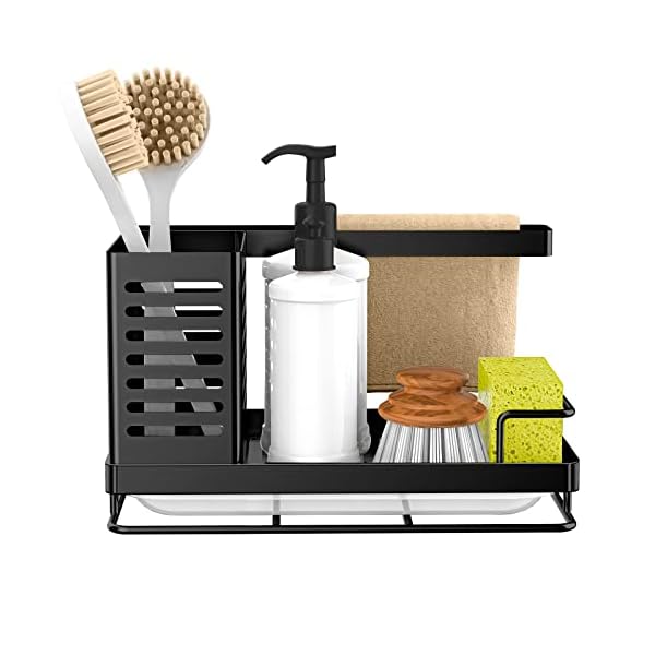 - Sink Caddy / Organizer, Sponge Holder Stainless Steel Caddy for Kitchen Sink with Removable Drain Pan Storage for Soap, Scrubber Brush, Bottles, Dishcloth-Black