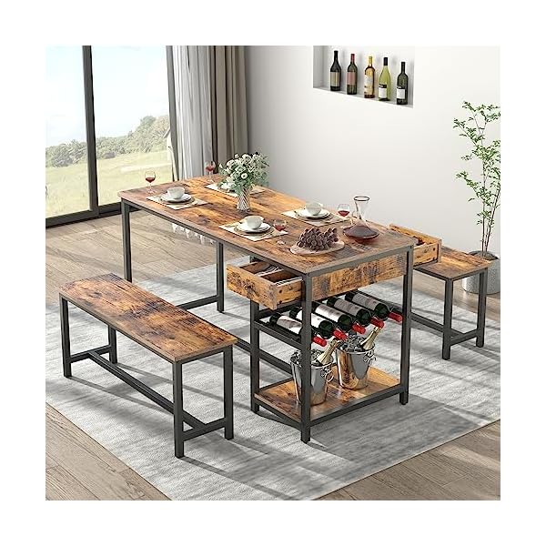 - STIKELY Dining Table Set for 4-6 People, 3 Pieces Kitchen Dinner Table Set with 2 Drawers & Long Benches, Dining Room Table with Wine Rack & Glass Holder and Storage Shelf for Home Kitchen Use